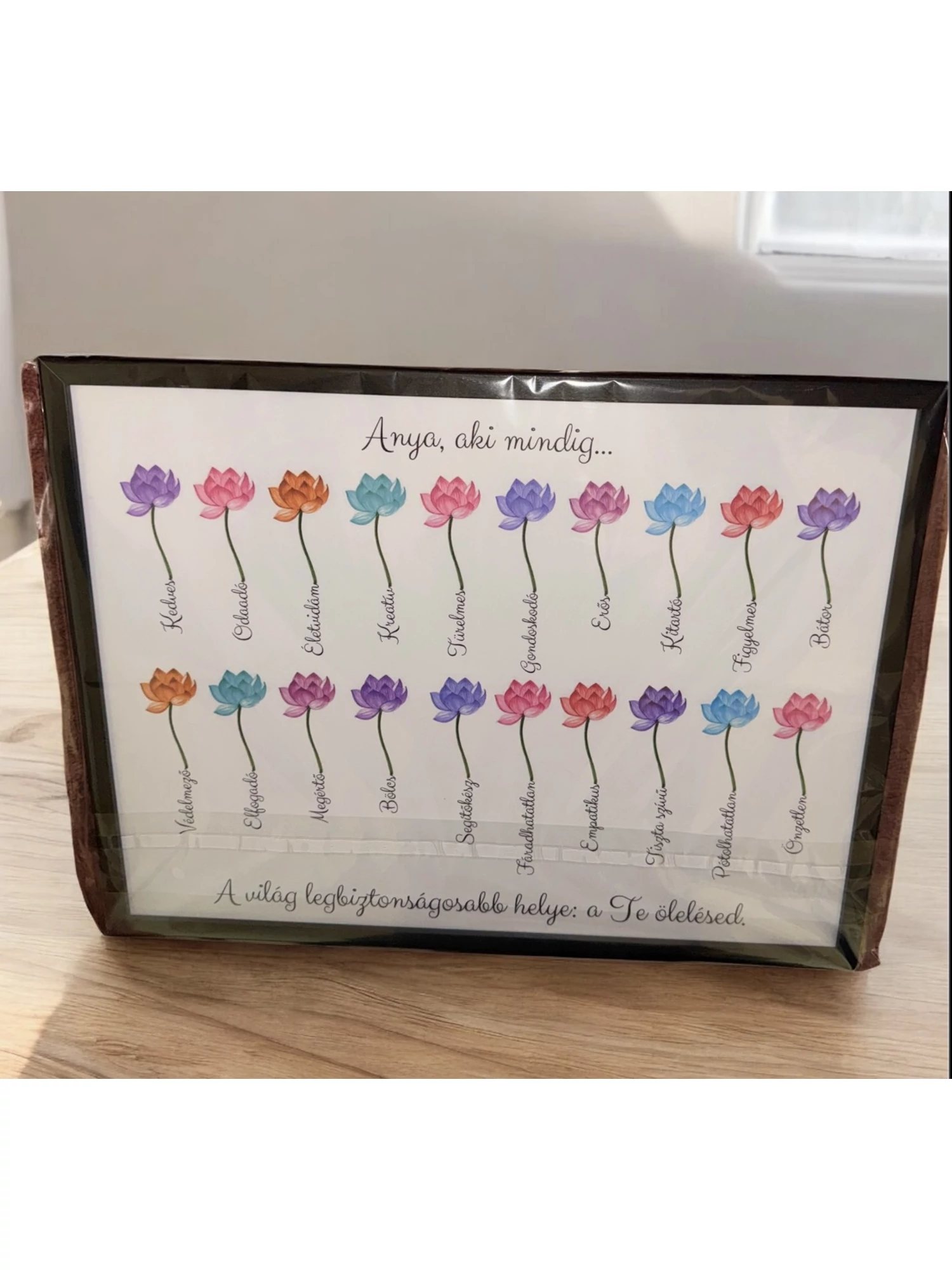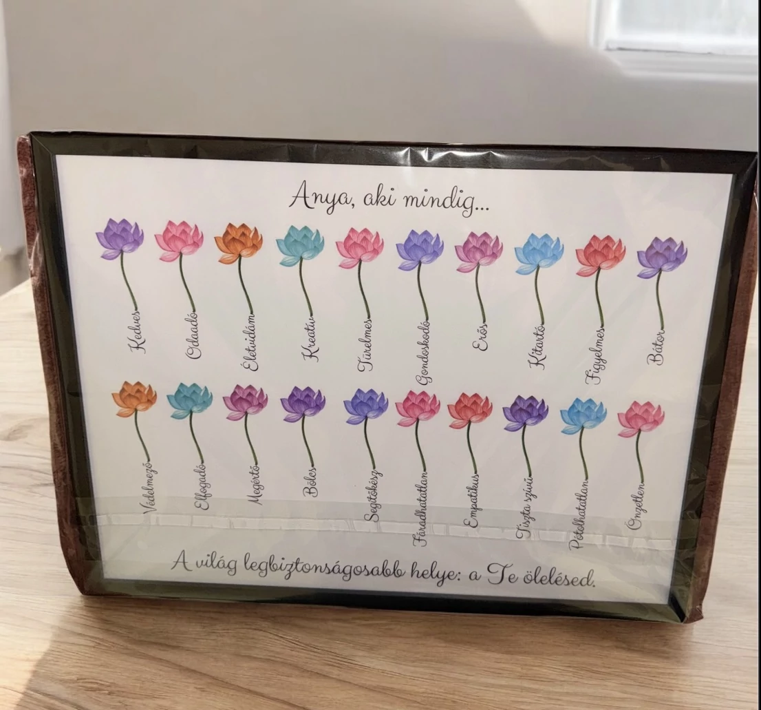 A felső megszólítás, a tulajdonságok és az alsó idézet igény szerint személyre szabható, így igazán egyedi ajándék készülhet.